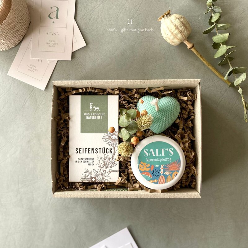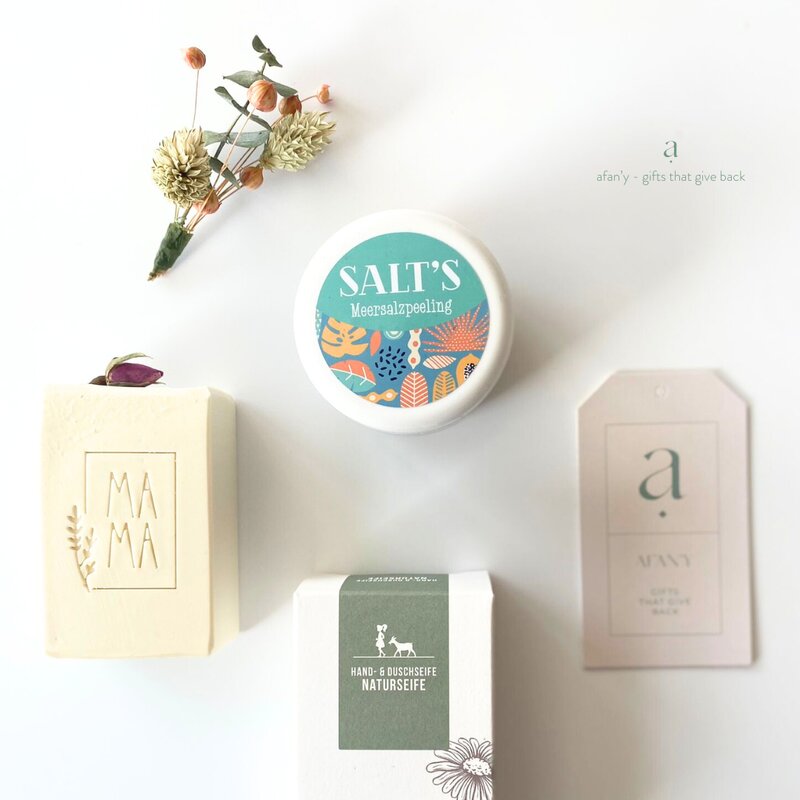 Alle hier erwähnten Produkte sind von Hand in der Schweiz von lokalen Handwerkern und kleinen Ateliers hergestellt. Das gewisse Extra: das handgemachte Meersalzpeeling ist ein inklusives Produkt, das von der HPV Uzwil-Flawil in einer geschützten Werkstatt hergestellt wurde.