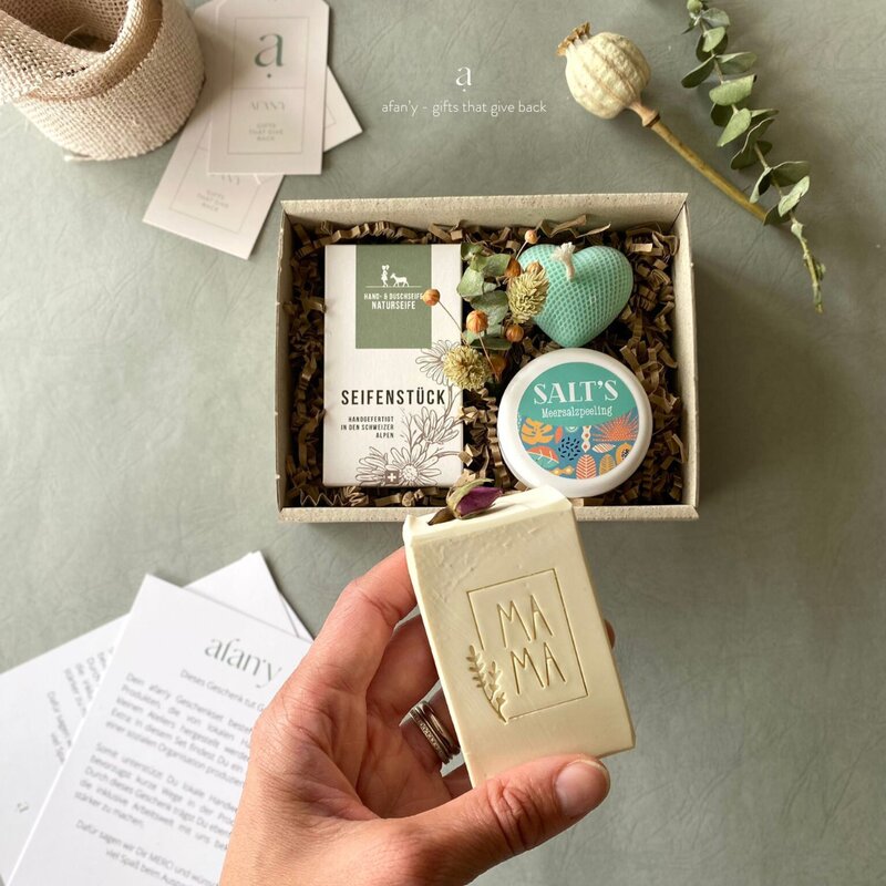 - eine in den Schweizer Alpen handgefertigte Seife, mit dem schönen Schriftzug “MAMA” und warmem Lindenblütenduft