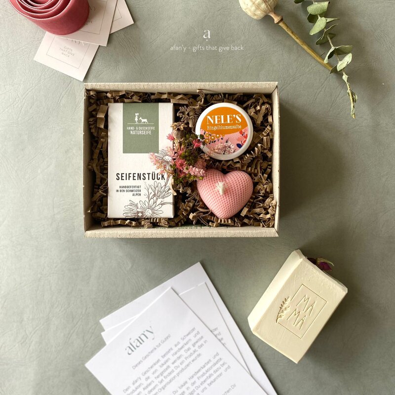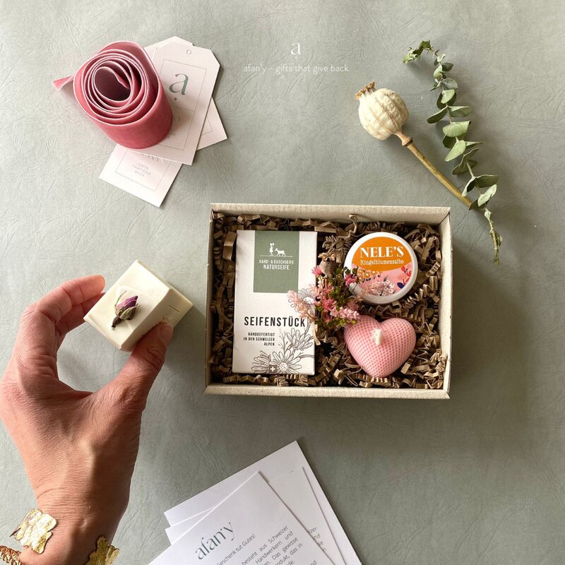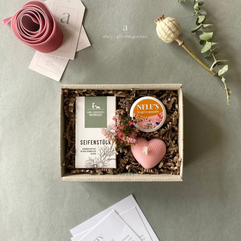 - und eine handgemachte Kerze in Herzform aus Rapswachs, 100% vegan.