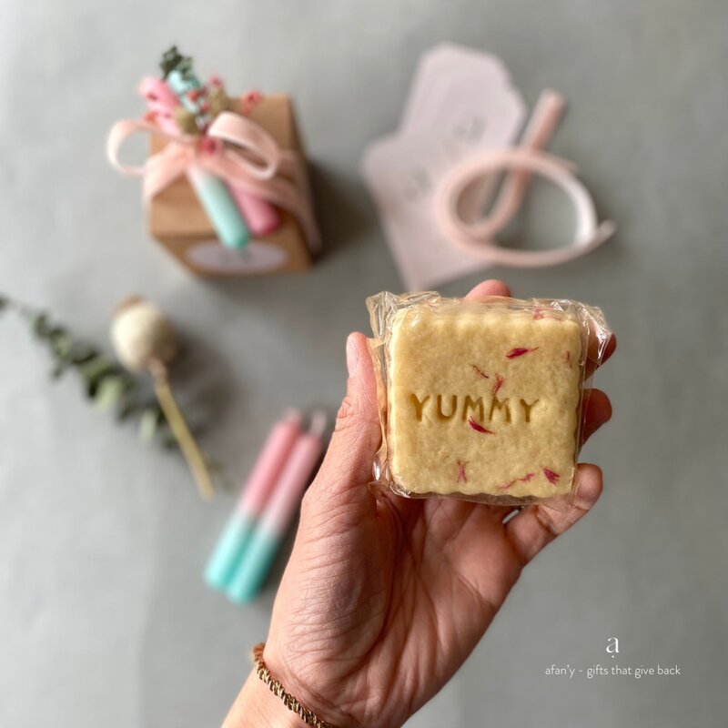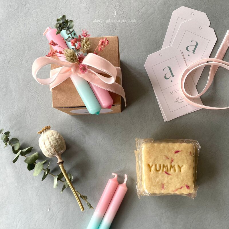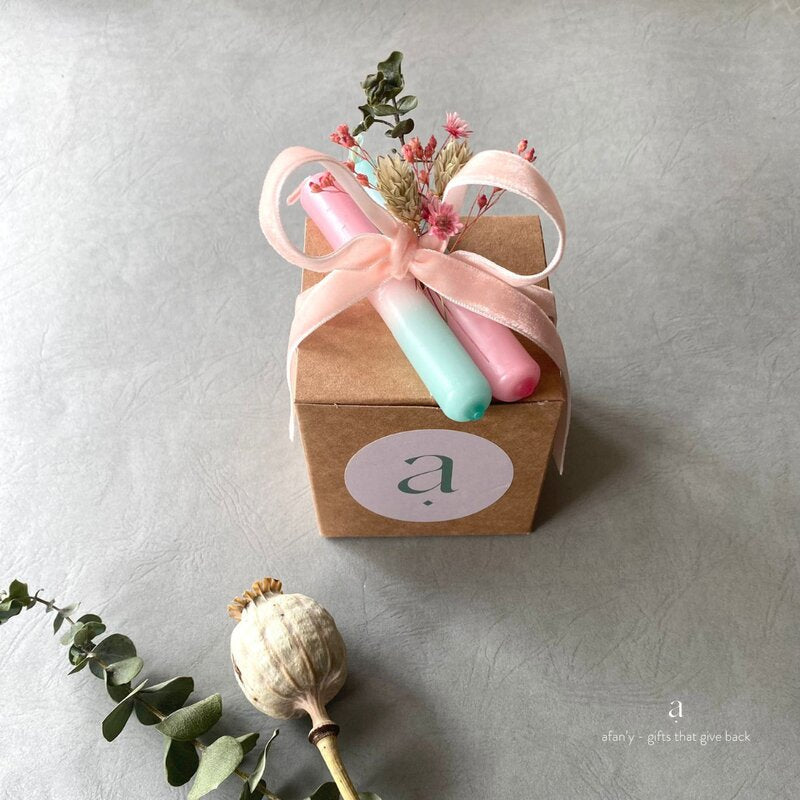 Dieses afan'y Set beinhaltet 5 leckere Buttercookies mit getrockneten Kornblumenblüten verziert. Alles handgemacht und in einer schönen mit zwei handgefertigten Kerzen dekorierten Box. Die Kerzen sind aus recyceltem Wachs und speziell für afan'y designt.