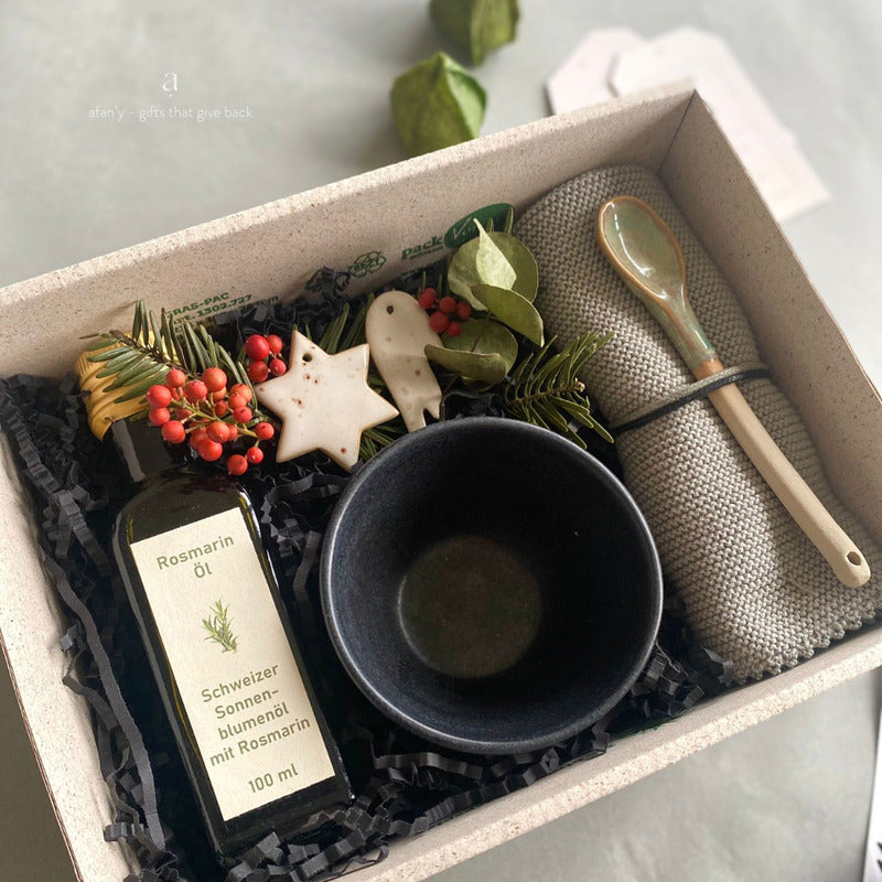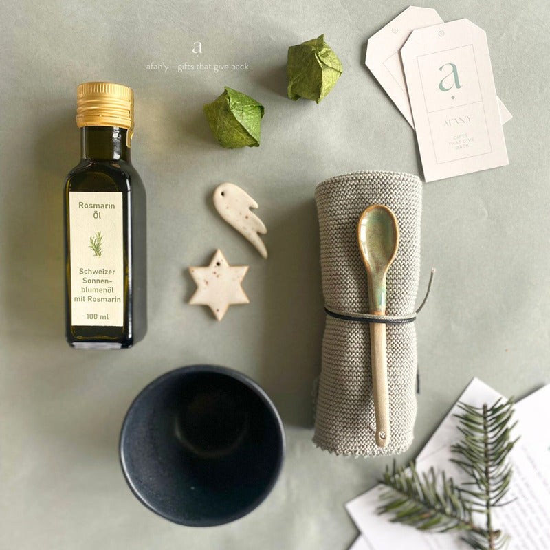 Tous les produits énoncés sont faits artisanalement en Suisse par des créateurs et artisans locaux. Notre plus : L'huile au romarin est un produit inclusif, fabriqué par l'organisation SAH Atlier für Frauen à Lucerne.