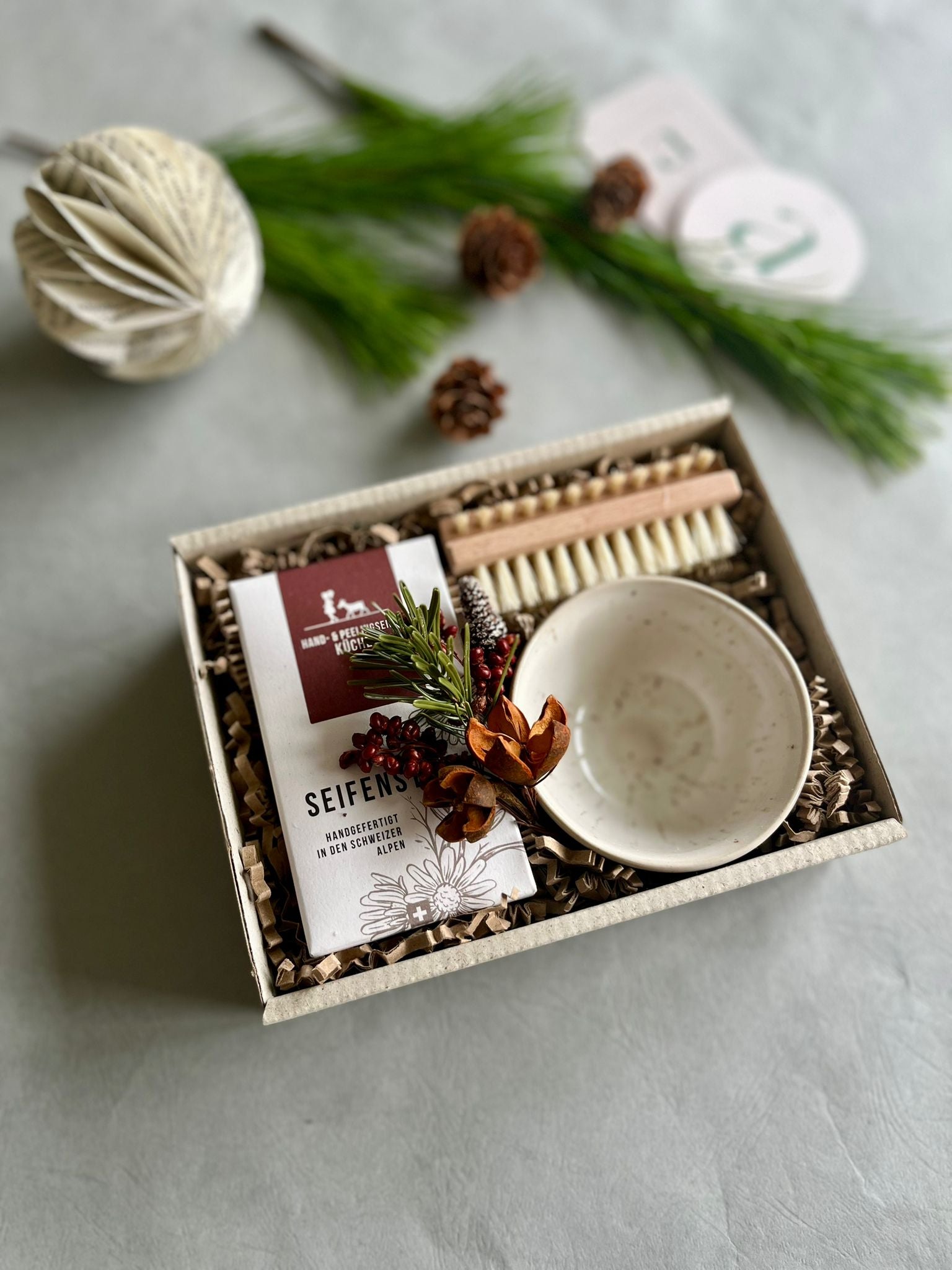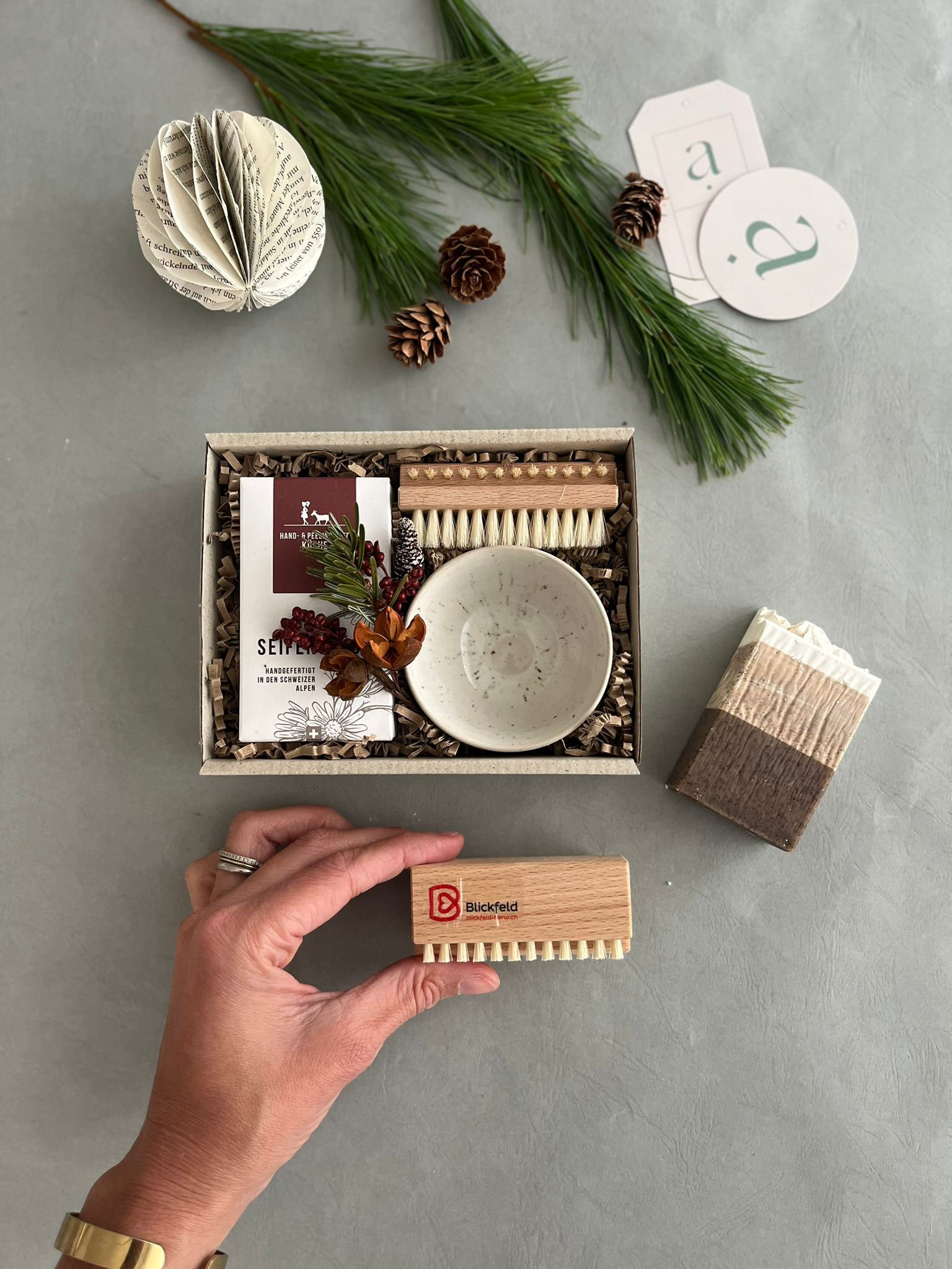 Tous les produits énoncés sont faits main en Suisse par des créateurs et artisans locaux. Notre plus engagé : La brosse à ongles et pour les mains est un produit inclusif, fabriqué par l'institution Blickfeld à Horw (Lucerne).